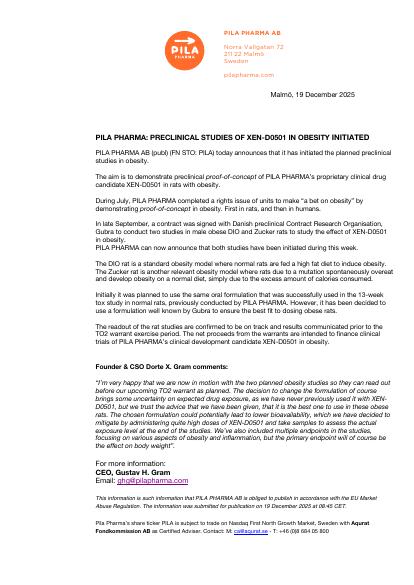This information is such information that PILA PHARMA AB is obliged to publish in accordance with the EU Market Abuse Regulation. The information was submitted for publication on 19 December 2025 at 08:45 CET.