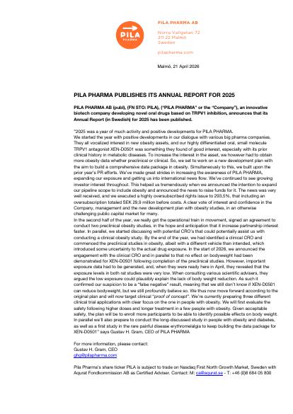 PILA PHARMA AB (publ), (FN STO: PILA), ("PILA PHARMA" or the "Company"), an innovative biotech company developing novel oral drugs based on TRPV1 inhibition, announces that its Annual Report (in Swedish) for 2025 has been published.