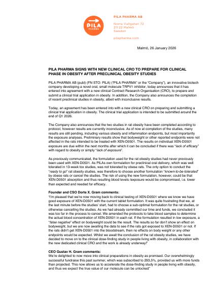 PILA PHARMA AB (publ) (FN STO: PILA) ("PILA PHARMA" or the "Company"), an innovative biotech company developing a novel oral, small molecule TRPV1 inhibitor, today announces that it has entered into agreement with a new clinical Contract Research Organisation (CRO), to prepare and submit a clinical trial application in obesity. In addition, the Company also announces the completion of recent preclinical studies in obesity, albeit with inconclusive results.