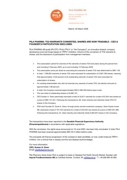 PILA PHARMA AB (publ) (FN STO: PILA) ("PILA" or "the Company"), an innovative biotech company developing novel oral drugs based on TRPV1 inhibition, informs of the conversion of TO2 warrants to shares, and the disclosure of participation from management members.