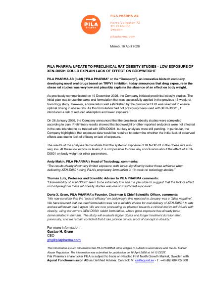 This information is such information that PILA PHARMA AB is obliged to publish in accordance with the EU Market Abuse Regulation. The information was submitted for publication on 16 April 2026 at 14:15 CEST.