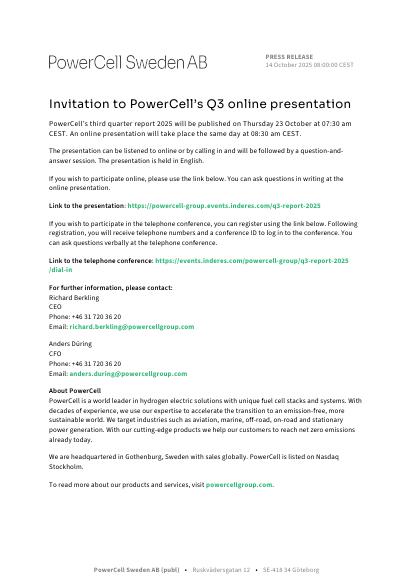 PowerCell's third quarter report 2025 will be published on Thursday 23 October at 07:30 am CEST. An online presentation will take place the same day at 08:30 am CEST.