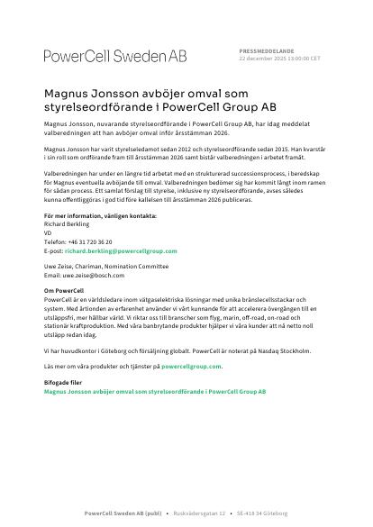Magnus Jonsson, nuvarande styrelseordförande i PowerCell Group AB, har idag meddelat valberedningen att han avböjer omval inför årsstämman 2026.