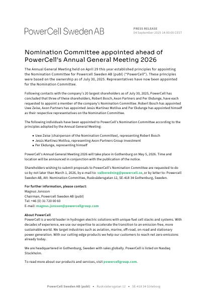 The Annual General Meeting held on April 29 this year established principles for appointing the Nomination Committee for Powercell Sweden AB (publ) ("PowerCell"). These principles were based on the ownership as of July 30, 2025. Representatives have now been appointed for the Nomination Committee.