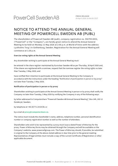 The shareholders of Powercell Sweden AB (publ), company registration no. 556759-8353, (“PowerCell” or the “Company”), are hereby given notice to attend the Annual General Meeting to be held on Monday 11 May 2026 at 2:00 p.m. at World of Volvo with the address Lyckholms Torg 1 in Gothenburg, Sweden. Registration for the Annual General Meeting will commence at 1:30 p.m.