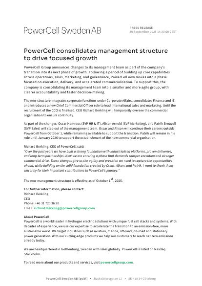 "Over the past years we have built a strong foundation with industrialised platforms, proven deliveries, and long-term partnerships. Now we are entering a phase that demands sharper execution and stronger commercial drive. These changes give us the agility and precision we need to capture the opportunities ahead, while building on the solid foundation created by Oscar, Alison, and Patrik. I want to thank them sincerely for their important contributions to PowerCell's journey."