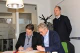 (IMG_4955) Johan Abrahamsson, Chairman of the City Council (M) in Mariestad, signs the agreement together with Pontus Lundgren, CEO of Nilsson Energy AB. Kristofer Svensson, Mariestad's commissioner,oversees the procedure.