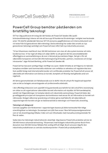 ”Vi har tillsammans med Bosch över 200 000 testimmar som visar att våra system kommer att möta kundernas krav. Vi har inget att dölja och väljer därför nu att genom det här pressmeddelandet offentliggöra en sammanfattning av de svar vi lämnat på journalistens frågor. Det gör vi för att säkerställa transparens och korrekt informationsgivning till kunder, partners, investerare och övriga intressenter” säger Richard Berkling, vd för PowerCell Sweden AB.