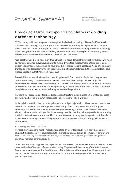 SVT has today published a segment claiming that the fuel cell technology of PowerCell Sweden AB (publ) risks not meeting customer expectations in accordance with signed agreements. To support these claims, SVT refers to anonymous sources and internal documents relating to tests of technology that is two generations old. This technology has since been replaced by updated technology, while PowerCell has also implemented entirely new industrial processes.