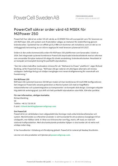 PowerCell har säkrat en order till ett värde av 43 MSEK från ett europeiskt varv för leverans av sitt M2Power 250, ett system som framställer vätgas av metanol för elektrifiering genom bränsleceller. Systemet har en effekt på 0,5 MW och kommer att installeras som en del av en ombyggnad/renovering av en större segelyacht med leverans planerad till 2027.