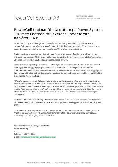 "Efter den nyligen genomförda lanseringen av vårt erbjudande inom kraftgenerering är vi glada att se tidig kundacceptans och kunna teckna order på det nya Power System 190", säger Richard Berkling, vd för PowerCell Group. "Enetech och deras partner MerElektro är pionjärer på en framväxande marknad där applikationskunskap, integrationsförmåga och snabbhet kommer att vara avgörande. Vi ser fram emot att stödja deras utveckling med ett bränslecellsystem som är utvecklat för krävande tillämpningar i verklig drift."