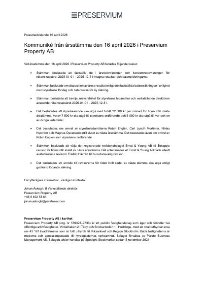 Vid årsstämma den 16 april 2026 i Preservium Property AB fattades följande beslut: