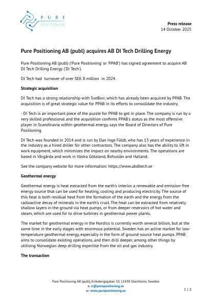 - DI Tech is an important piece of the puzzle for PPAB to get in place. The company is run by a very skilled professional and the acquisition confirms PPAB's status as the most offensive player in Scandinavia within geothermal energy, says the Board of Directors of Pure Positioning