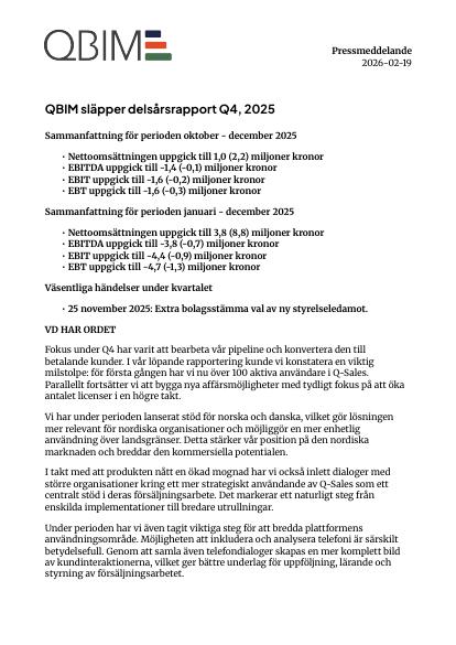Denna information är sådan information som Qbim Aktiebolag är skyldigt att offentliggöra enligt EU:s marknadsmissbruksförordning. Informationen lämnades, genom ovanstående kontaktperson(er)s försorg, för offentliggörande den 2026-02-19 08:45 CET.