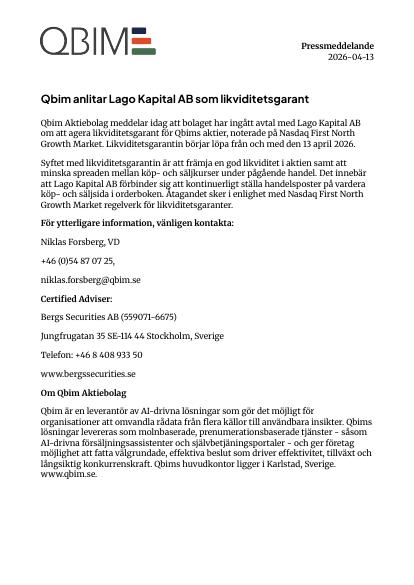 Qbim Aktiebolag meddelar idag att bolaget har ingått avtal med Lago Kapital AB om att agera likviditetsgarant för Qbims aktier, noterade på Nasdaq First North Growth Market. Likviditetsgarantin börjar löpa från och med den 13 april 2026.