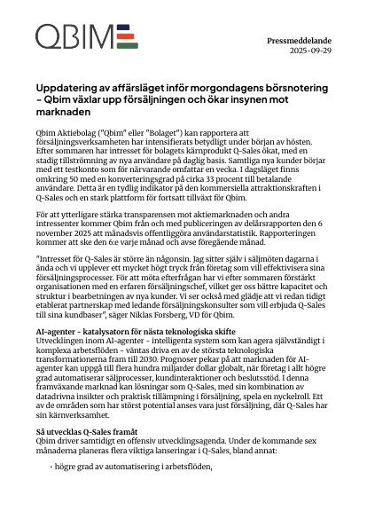 För att ytterligare stärka transparensen mot aktiemarknaden och andra intressenter kommer Qbim från och med publiceringen av delårsrapporten den 6 november 2025 att månadsvis offentliggöra användarstatistik. Rapporteringen kommer att ske den 6:e varje månad och avse föregående månad.