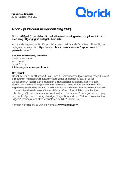 Qbrick AB (publ) meddelar härmed att årsredovisningen för 2025 finns från och med idag tillgänglig på bolagets hemsida.