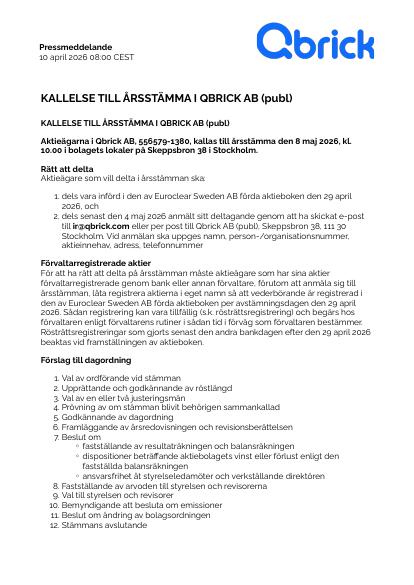 Aktieägarna i Qbrick AB, 556579-1380, kallas till årsstämma den 8 maj 2026, kl. 10.00 i bolagets lokaler på Skeppsbron 38 i Stockholm.
