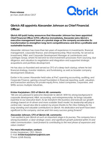 Qbrick AB (publ) today announces that Alexander Johnson has been appointed Chief Financial Officer (CFO), effective immediately. Alexander joins Qbrick's executive management team at a pivotal stage as the company accelerates its transformation to strengthen long-term competitiveness and drive a profitable and sustainable business.