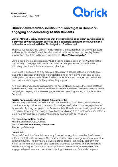 Qbrick AB (publ) today announces that the company is once again participating as a provider of video platform services and a collaboration partner to Kruso in the national educational initiative Skolvalget 2026 in Denmark.