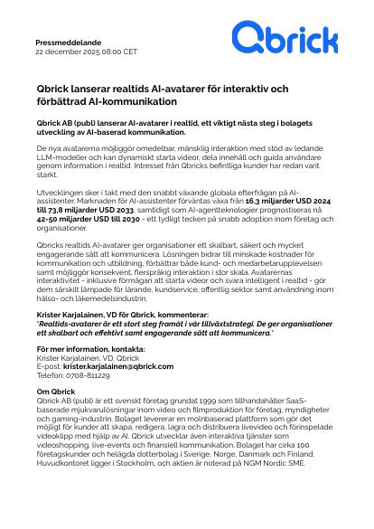 Qbrick AB (publ) lanserar AI-avatarer i realtid, ett viktigt nästa steg i bolagets utveckling av AI-baserad kommunikation.
