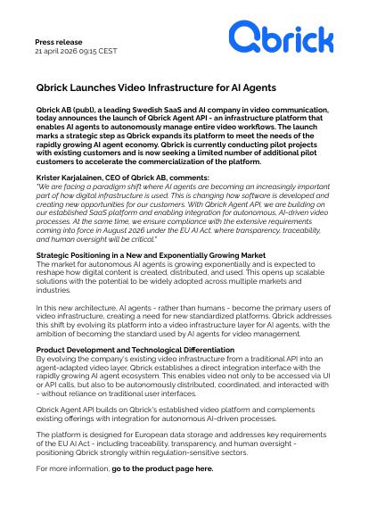 Qbrick AB (publ), a leading Swedish SaaS and AI company in video communication, today announces the launch of Qbrick Agent API - an infrastructure platform that enables AI agents to autonomously manage entire video workflows. The launch marks a strategic step as Qbrick expands its platform to meet the needs of the rapidly growing AI agent economy. Qbrick is currently conducting pilot projects with existing customers and is now seeking a limited number of additional pilot customers to accelerate the commercialization of the platform.