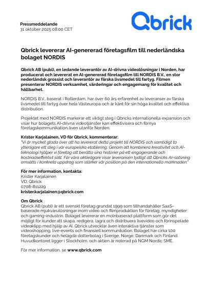 Qbrick AB (publ), en ledande leverantör av AI-drivna videolösningar i Norden, har producerat och levererat en AI-genererad företagsfilm till NORDIS B.V., en stor nederländsk grossist och leverantör av färska livsmedel till fartyg. Filmen presenterar NORDIS verksamhet, värderingar och engagemang för kvalitet och hållbarhet.