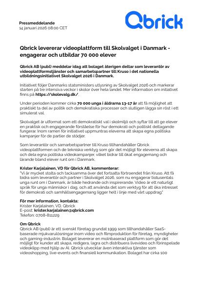 Qbrick AB (publ) meddelar idag att bolaget återigen deltar som leverantör av videoplattformstjänster och samarbetspartner till Kruso i det nationella utbildningsinitiativet Skolvalget 2026 i Danmark.