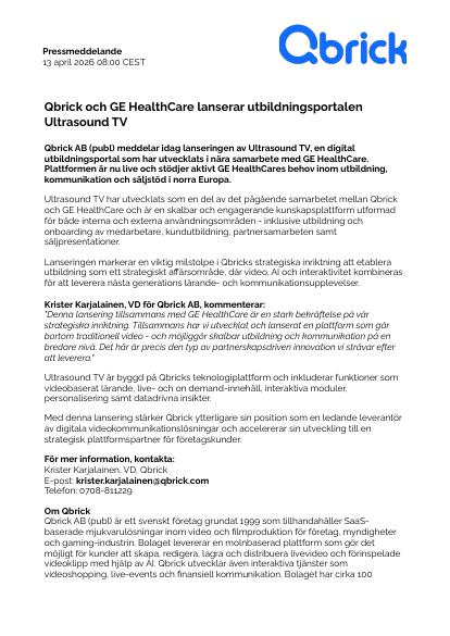 Qbrick AB (publ) meddelar idag lanseringen av Ultrasound TV, en digital utbildningsportal som har utvecklats i nära samarbete med GE HealthCare. Plattformen är nu live och stödjer aktivt GE HealthCares behov inom utbildning, kommunikation och säljstöd i norra Europa.
