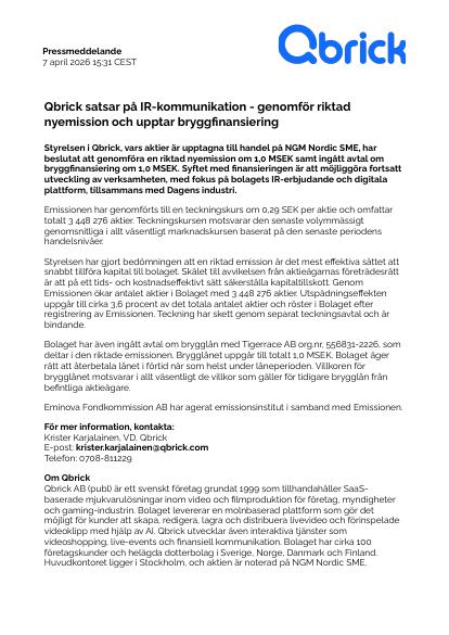 Styrelsen i Qbrick, vars aktier är upptagna till handel på NGM Nordic SME, har beslutat att genomföra en riktad nyemission om 1,0 MSEK samt ingått avtal om bryggfinansiering om 1,0 MSEK. Syftet med finansieringen är att möjliggöra fortsatt utveckling av verksamheten, med fokus på bolagets IR-erbjudande och digitala plattform, tillsammans med Dagens industri.