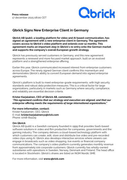 Qbrick AB (publ), a leading platform for video and AI based communication, has signed an agreement with a new enterprise client in Germany. The agreement covers access to Qbrick's video platform and extends over 12 months. This agreement marks an important step in Qbrick's re-entry onto the German market and supports the company's overall European growth strategy.