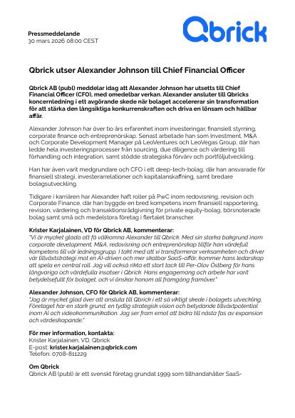 "Vi är mycket glada att få välkomna Alexander till Qbrick. Med sin starka bakgrund inom corporate development, M&A, redovisning och entreprenörskap tillför han värdefull kompetens till vår ledningsgrupp. I takt med att vi transformerar verksamheten och driver vår tillväxtstrategi mot en AI-driven och mer skalbar SaaS-affär, kommer hans ledarskap att spela en central roll. Jag vill också rikta ett stort tack till Per-Olov Östberg för hans långvariga och värdefulla insatser i Qbrick. Hans engagemang och arbete har varit betydelsefullt för bolaget, och vi önskar honom all framgång framöver."