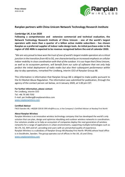"We are very proud to have won the trust of one of world's largest mobile operators at a critical junction in the transition from 4G to 5G, one characterised by an increased emphasis on cellular indoor mobility in close coordination with that of the outdoor. It is our hope that China Unicom, as well as its ecosystem partners, will benefit from our suite of software that not only help perfect the initial deployment of radio nodes but also their subsequent performance within day-to-day operations, remarked Per Lindberg, interim CEO of Ranplan Group AB.