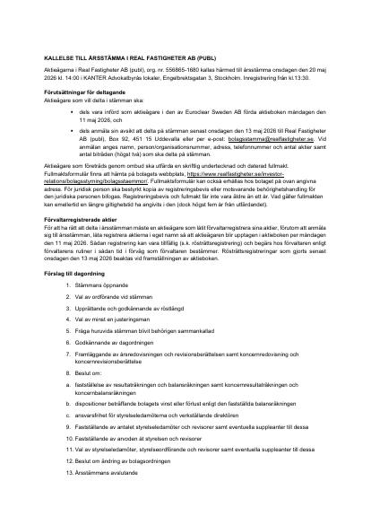 Aktieägarna i Real Fastigheter AB (publ), org. nr. 556865-1680 kallas härmed till årsstämma onsdagen den 20 maj 2026 kl. 14:00 i KANTER Advokatbyrås lokaler, Engelbrektsgatan 3, Stockholm. Inregistrering från kl.13:30.