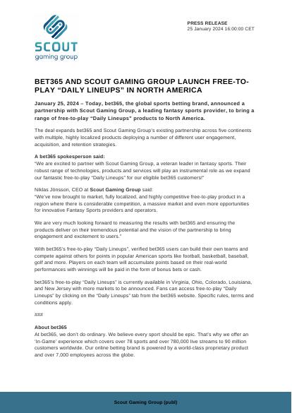 “We are excited to partner with Scout Gaming Group, a veteran leader in fantasy sports. Their robust range of technologies, products and services will play an instrumental role as we expand our fantastic free-to-play “Daily Lineups” for our eligible bet365 customers!”