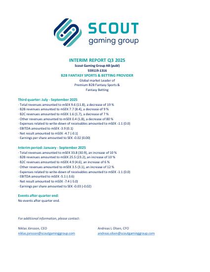 This information is information that Scout Gaming Group (publ) is obliged to make public pursuant to the EU Market Abuse Regulation. The information was submitted for publication, through the agency of the contact persons set out above, at 2025-11-13 08:00 CET.