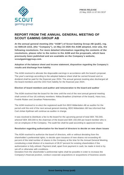 At the annual general meeting (the “AGM”) of Scout Gaming Group AB (publ), reg. no 559119-1316, (the “Company”), on May 22 2025 the AGM adopted, inter alia, the following resolutions. For more detailed information regarding the contents of the resolutions, please refer to the notice to the AGM and the proposals, which have previously been published and are available on the Company’s website, scoutgaminggroup.com.