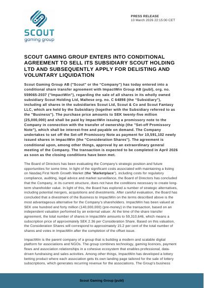 Scout Gaming Group AB ("Scout" or the “Company") has today entered into a conditional share transfer agreement with ImpactWin Group AB (publ), org. no. 559065-2037 ("ImpactWin"), regarding the sale of all shares in its wholly owned subsidiary Scout Holding Ltd, Maltese org. no. C 64898 (the “Subsidiary"), including all shares in the subsidiaries Scout Ltd, Scout & Co and Scout Fantasy LLC, which are held by the Subsidiary (together with the Subsidiary referred to as the ”Business"). The purchase price amounts to SEK twenty-five million (25,000,000) and shall be paid by ImpactWin issuing a promissory note to the Company in connection with the transfer of ownership (the ”Set-off Promissory Note"), which shall be interest-free and payable on demand. The Company undertakes to set off the Set-off Promissory Note as payment for 10,591,102 newly issued shares in ImpactWin (the "Consideration Shares"). The agreement is conditional upon, among other things, approval by an extraordinary general meeting of the Company. The transaction is expected to be completed in April 2026 as soon as the closing conditions have been met.