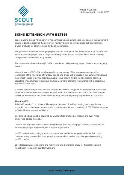 Scout Gaming Group (“Company” or “Scout”) has signed a multi-year extension of the agreement signed in 2022 concerning the delivery of Fantasy Sports as well as cross-sell and retention driving products for other verticals for bet365 operations.
