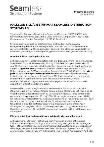Styrelsen för Seamless Distribution Systems AB, org. nr. 556979-4562, kallar härmed till årsstämma den 28 maj 2026 klockan 10:00 på CoW Hagastaden, Konferensrum Geniet, Sveavägen 151, 113 43 Stockholm.