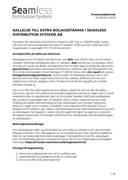 Styrelsen för Seamless Distribution Systems AB, org. nr. 556979-4562, kallar härmed till extra bolagsstämma den 31 oktober 2025 klockan 10:00 på CoW Hagastaden, Sveavägen 151, 113 43 Stockholm.