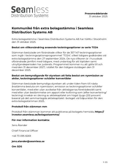 Extra bolagsstämma i Seamless Distribution Systems AB har hållits i Stockholm den 31 oktober 2025.