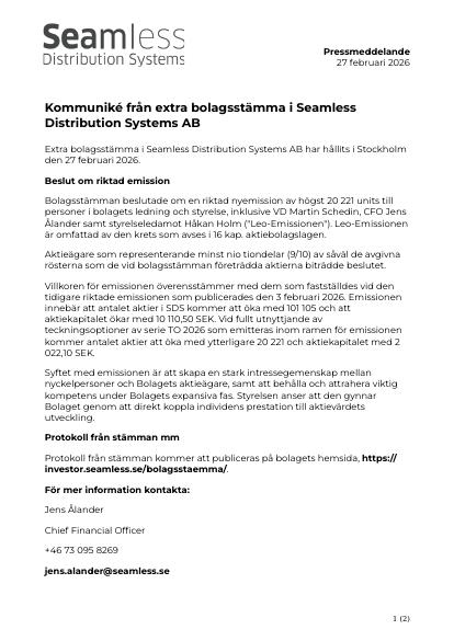 Extra bolagsstämma i Seamless Distribution Systems AB har hållits i Stockholm den 27 februari 2026.