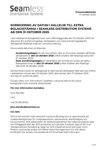 KORRIGERING AV DATUM I KALLELSE TILL EXTRA BOLAGSSTÄMMA I SEAMLESS DISTRIBUTION SYSTEMS AB DEN 31 OKTOBER 2025