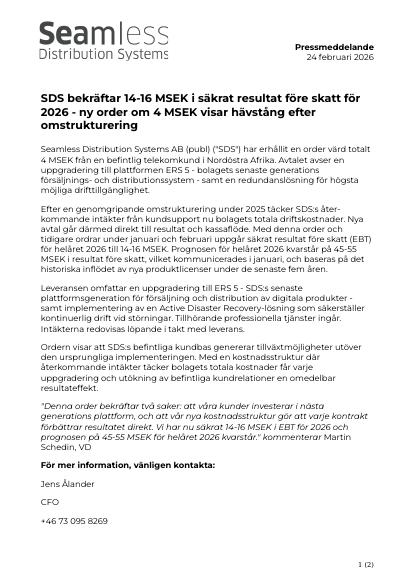 Efter en genomgripande omstrukturering under 2025 täcker SDS:s åter-kommande intäkter från kundsupport nu bolagets totala driftskostnader. Nya avtal går därmed direkt till resultat och kassaflöde. Med denna order och tidigare ordrar under januari och februari uppgår säkrat resultat före skatt (EBT) för helåret 2026 till 14-16 MSEK. Prognosen för helåret 2026 kvarstår på 45-55 MSEK i resultat före skatt, vilket kommunicerades i januari, och baseras på det historiska inflödet av nya produktlicenser under de senaste fem åren.