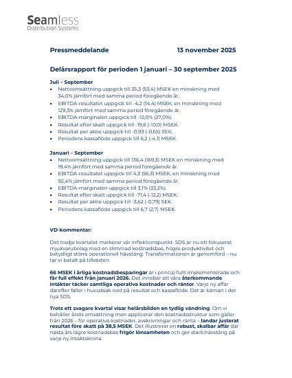 Denna information är sådan information som Seamless Distribution Systems AB (publ) är skyldig att offentliggöra enligt EU:s marknadsmissbruksförordning. Informationen lämnades för offentliggörande den 13 november 2025 kl. 08.30 CET.