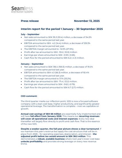 This information is information that Seamless Distribution Systems AB (publ) is obliged to make public pursuant to the EU Sheet Abuse Regulation. The information was submitted for publication on November 13, 2025, at 08:30 CET.