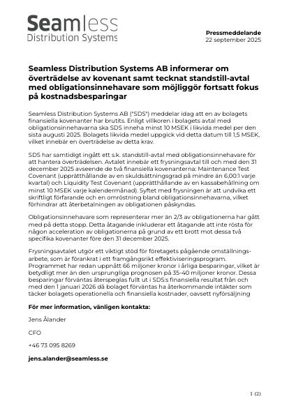 Seamless Distribution Systems AB ("SDS") meddelar idag att en av bolagets finansiella kovenanter har brutits. Enligt villkoren i bolagets avtal med obligationsinnehavarna ska SDS inneha minst 10 MSEK i likvida medel per den sista augusti 2025. Bolagets likvida medel uppgick vid detta datum till 1,5 MSEK, vilket innebär en överträdelse av detta krav.