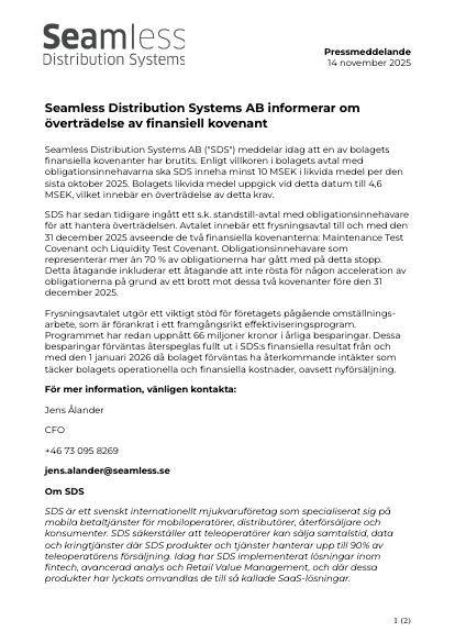 Seamless Distribution Systems AB ("SDS") meddelar idag att en av bolagets finansiella kovenanter har brutits. Enligt villkoren i bolagets avtal med obligationsinnehavarna ska SDS inneha minst 10 MSEK i likvida medel per den sista oktober 2025. Bolagets likvida medel uppgick vid detta datum till 4,6 MSEK, vilket innebär en överträdelse av detta krav.