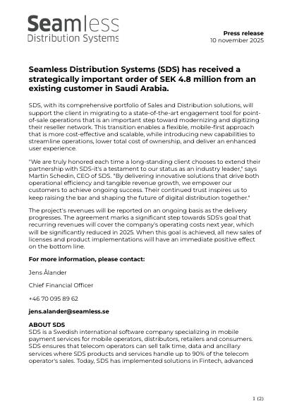 Seamless Distribution Systems (SDS) has received a strategically important order of SEK 4.8 million from an existing customer in Saudi Arabia.
